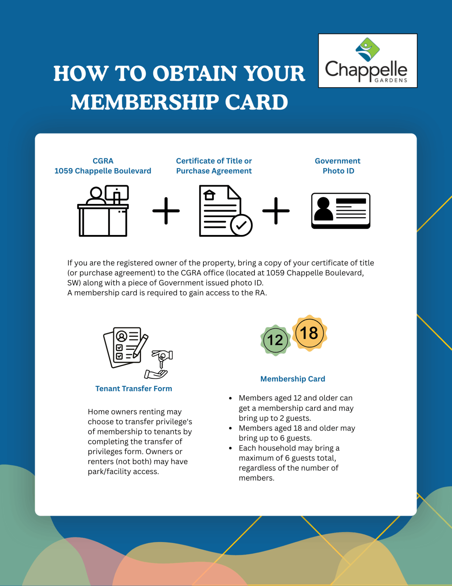 Welcome to the neighbourhood! We are excited to get to know you. If you are new to the Chappelle Gardens Community and have not received your membership card, we would love to invite you down to the Social House to create one, and to give you a tour of our Social House. Attached you will find our New Home Owner’s Form for you to complete. Fill out all information for every occupant of your home (including children). All occupants over the age of 12 will receive a membership card. Please bring proof of residency, and a piece of photo ID to create your card.